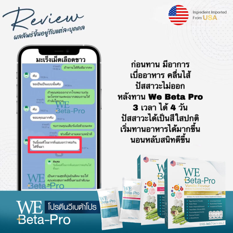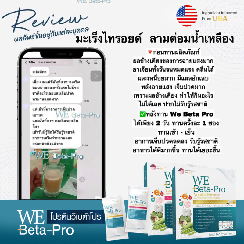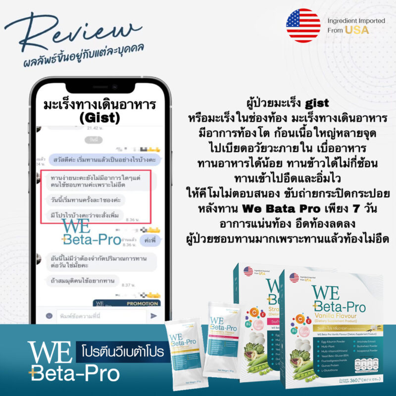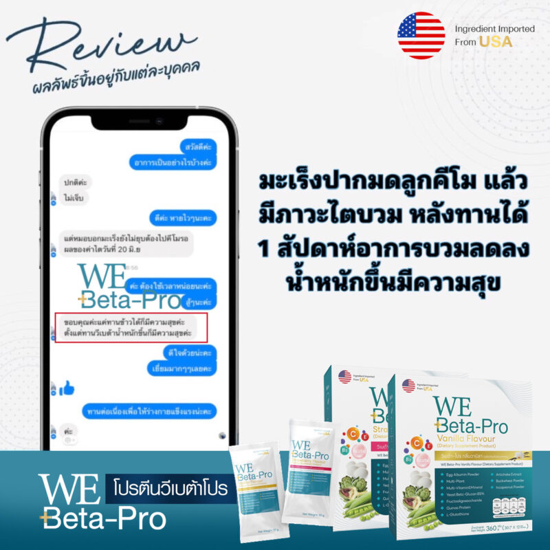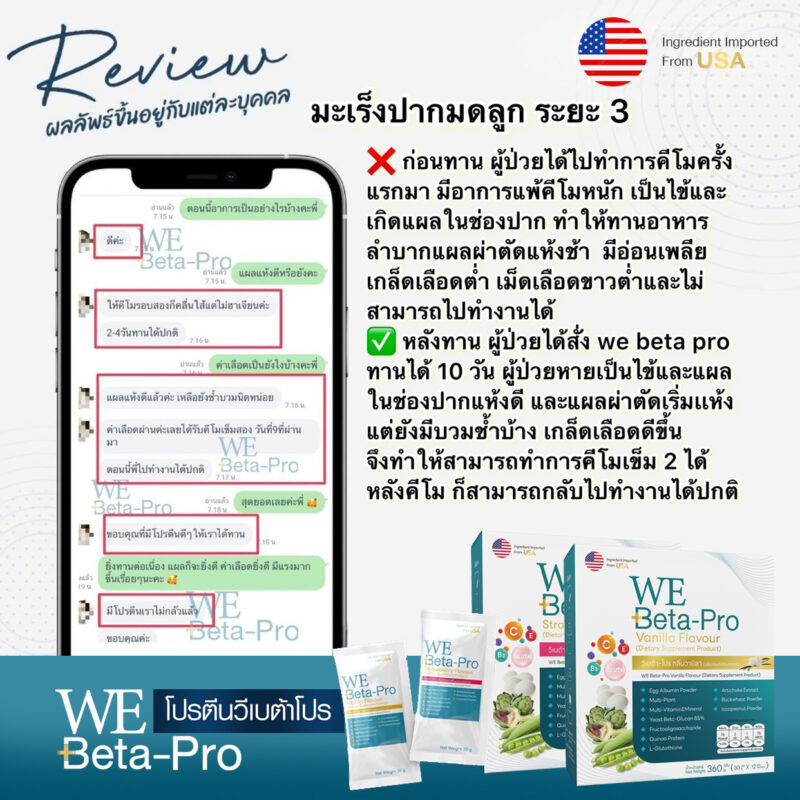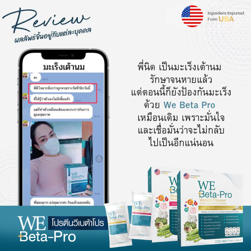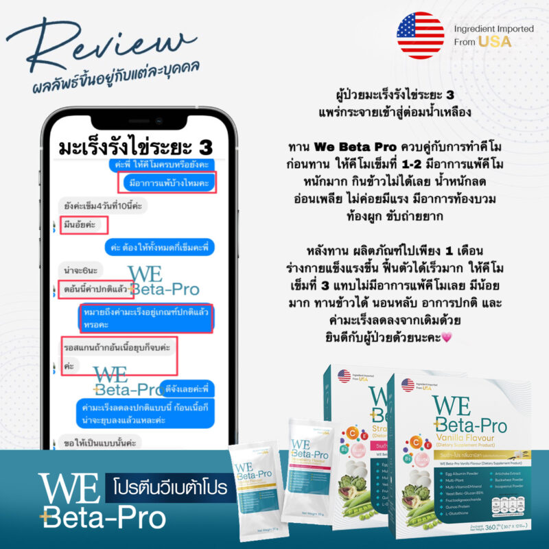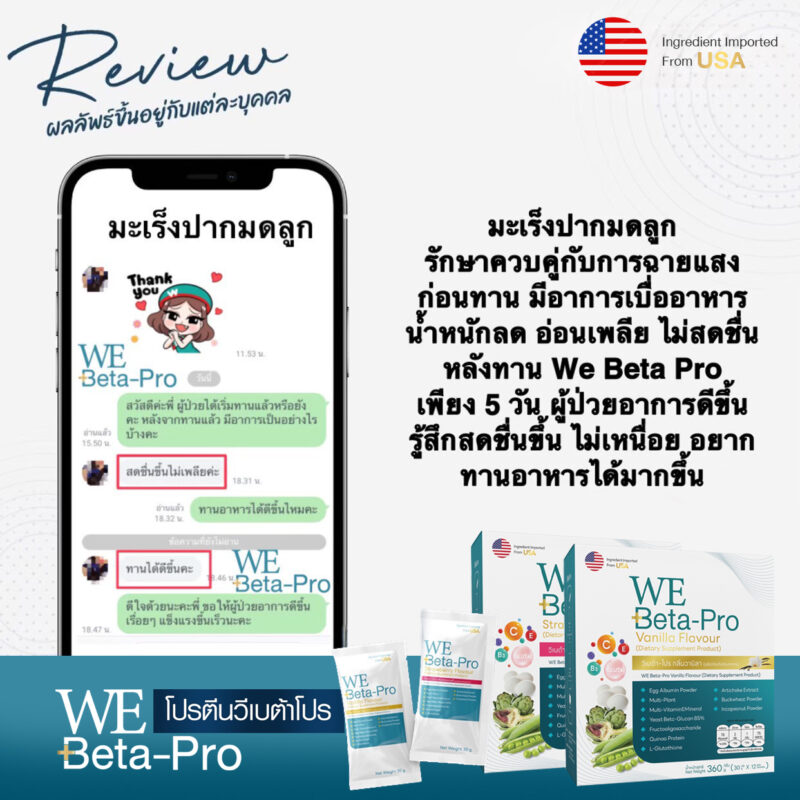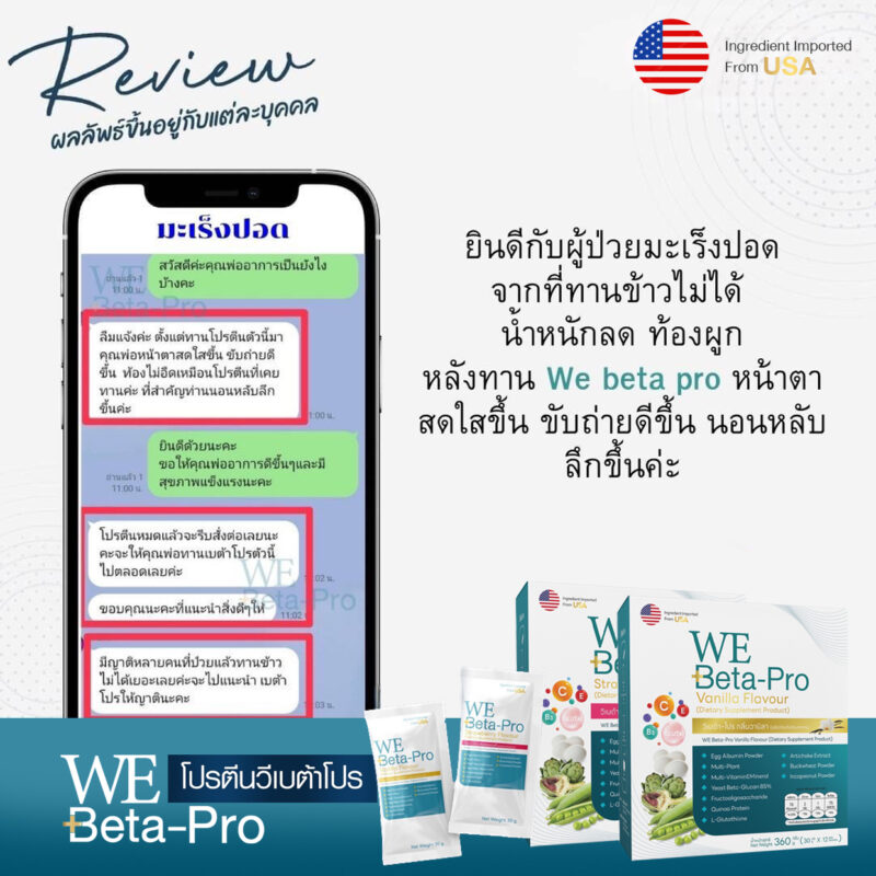 - ผู้ป่วยที่ให้เคมีบำบัด ฉายแสง หรือผ่าตัด สามารถทาน We Beta Pro (วีเบต้าโปร) เพื่อเร่งฟื้นฟูซ่อมแซมระบบที่เสียหาย และช่วยลดผลข้างเคียงจากการให้เคมีบำบัด ฉายแสงได้ดี