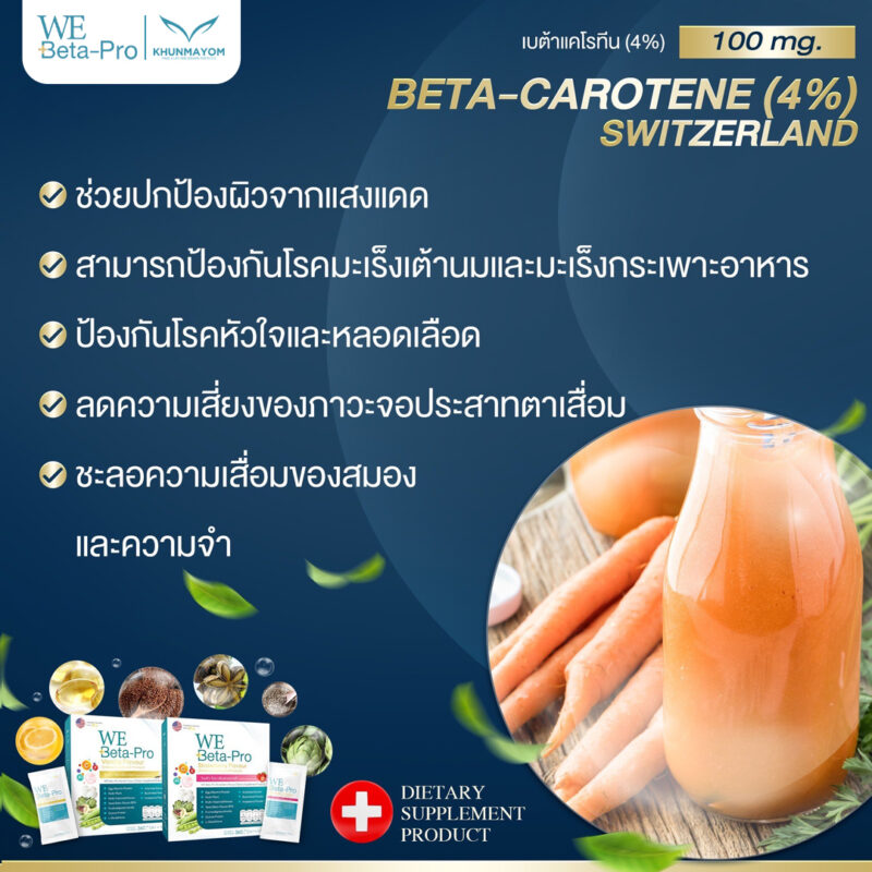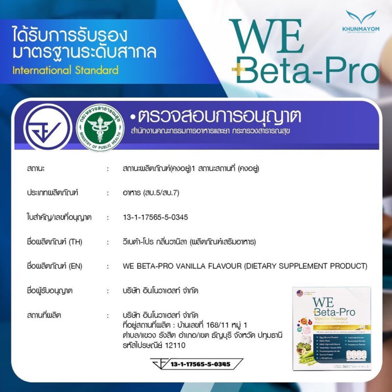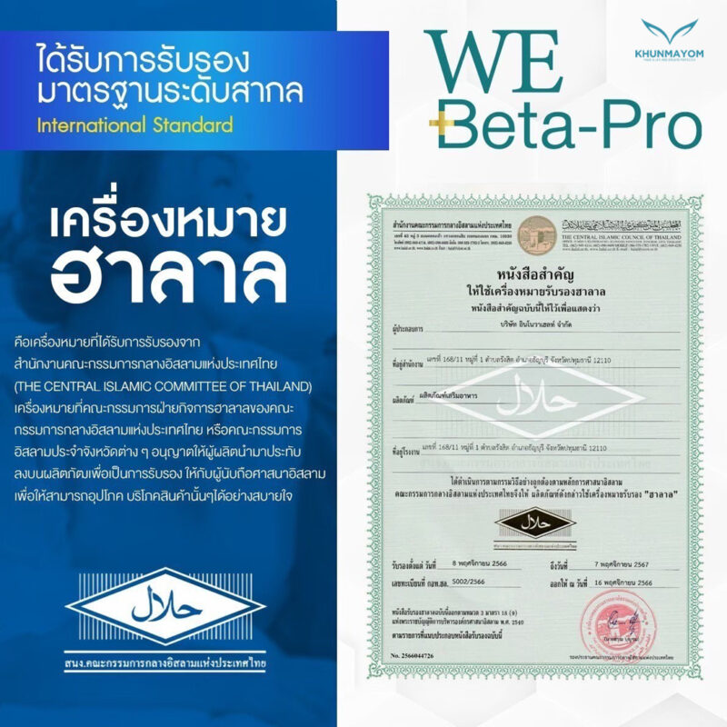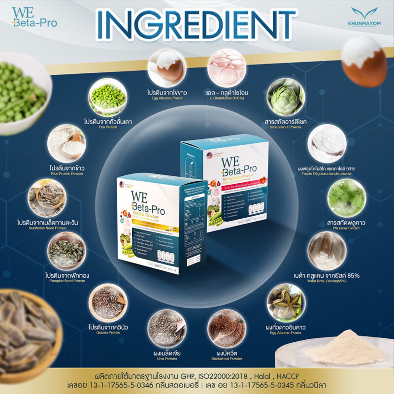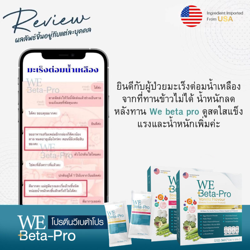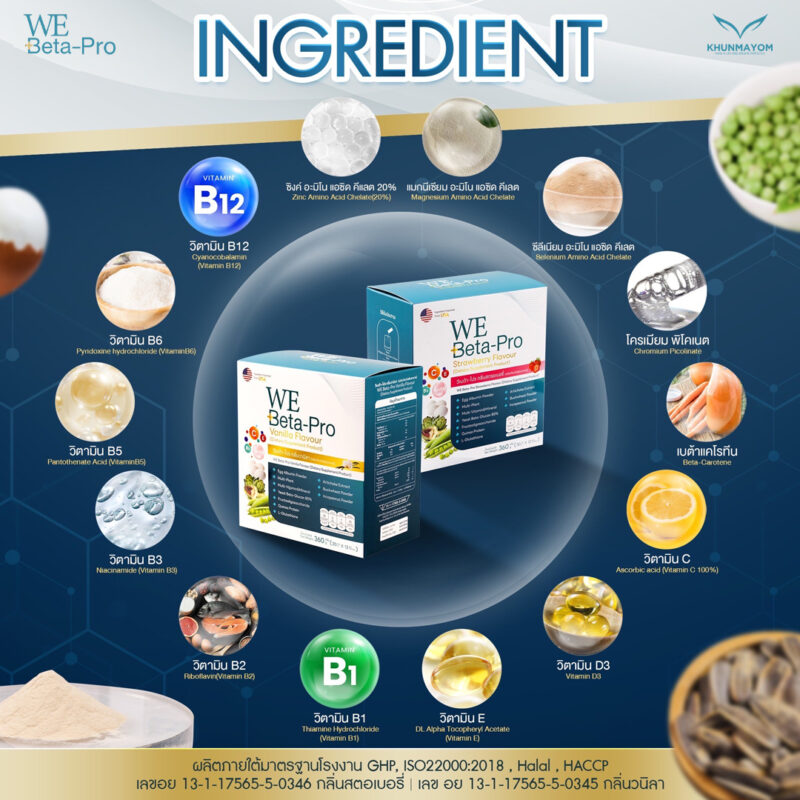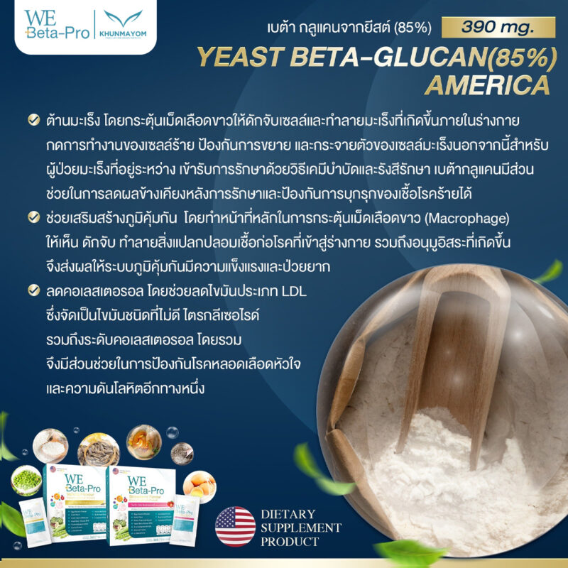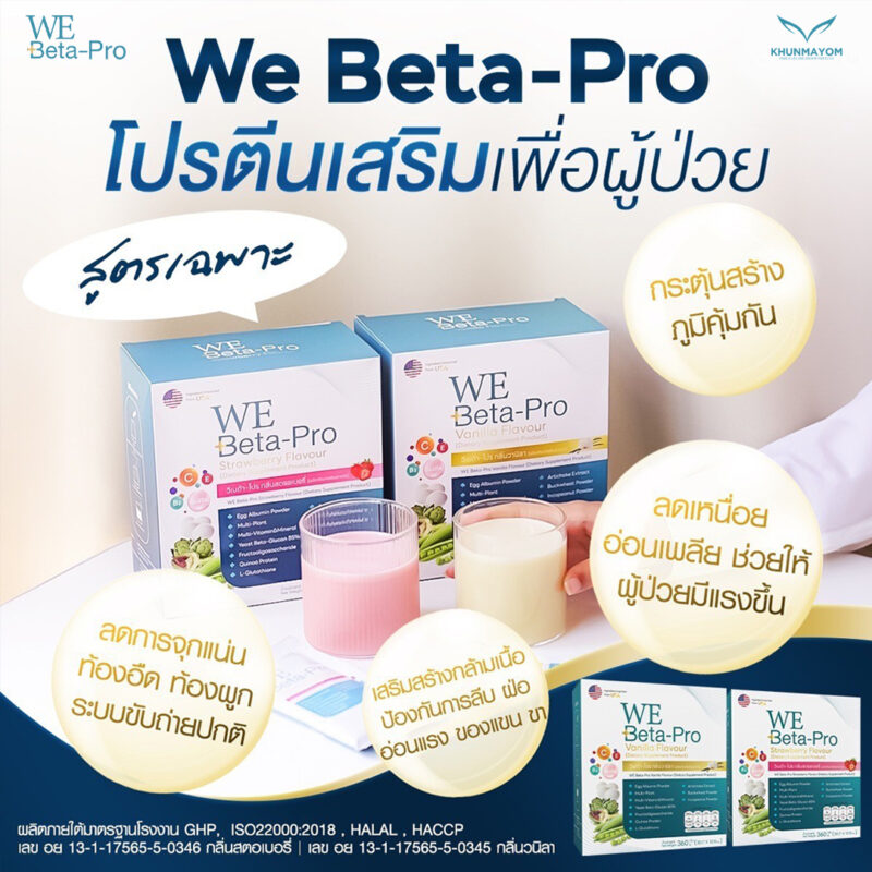 - We Beta Pro (วีเบต้าโปร) มีสารสกัดจาก เบต้ากลูแคน ซึ่งมีผลงานวิจัยมากมายหลายฉบับ ทั้งในประเทศและต่างประเทศ ว่ามีส่วนช่วยในการเพิ่มค่าการทำงานของเซลล์เม็ดเลือดขาว ได้เป็นอย่างดี เหมาะสำหรับผู้ป่วยที่ต้องการเพิ่มภูมิต้านทานให้กับร่างกายโดยเฉพาะ เช่น ผู้ป่วยโรคติดเชื้อ ผู้ป่วยโรคเบาหวาน ผู้ป่วยมะเร็งต่างๆ มีความจำเป็นต้องได้รับโปรตีนปริมาณสูงเพื่อช่วยเสริมทั้งเม็ดเลือดขาวและเม็ดเลือดแดง จึงจะช่วยให้ร่างกายแข็งแรงขึ้นได้ ป้องกันภาวะร่างการอ่อนเลีย อ่อนแรง เนื่องจากภูมิคุ้มกันต่ำ
