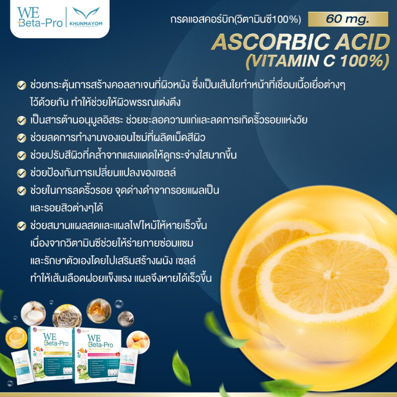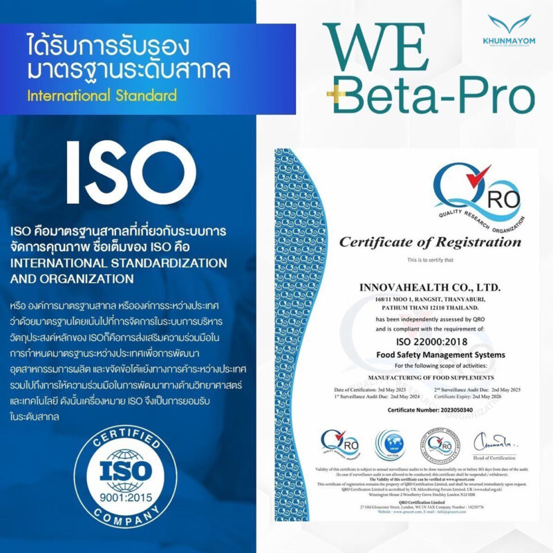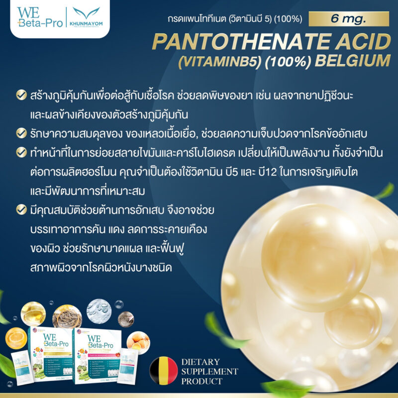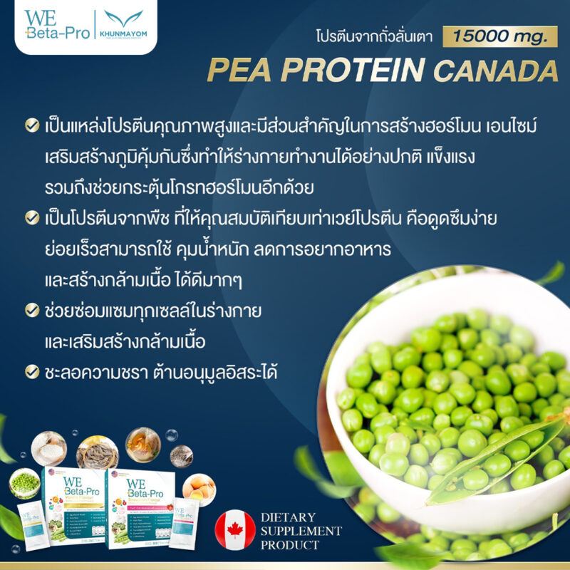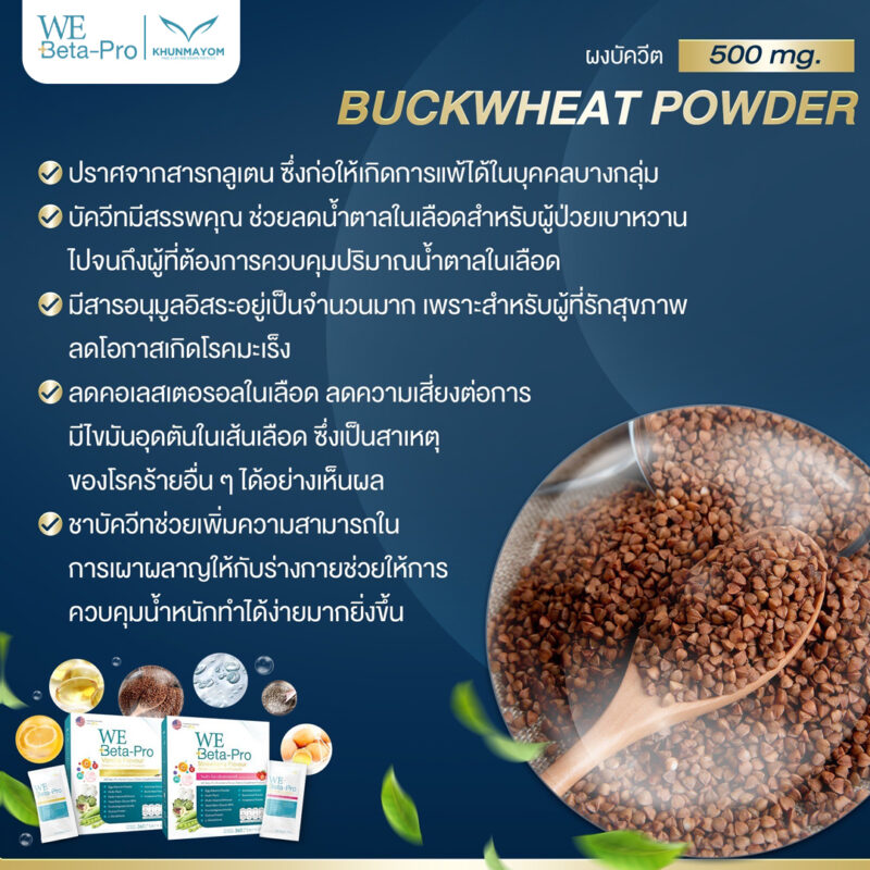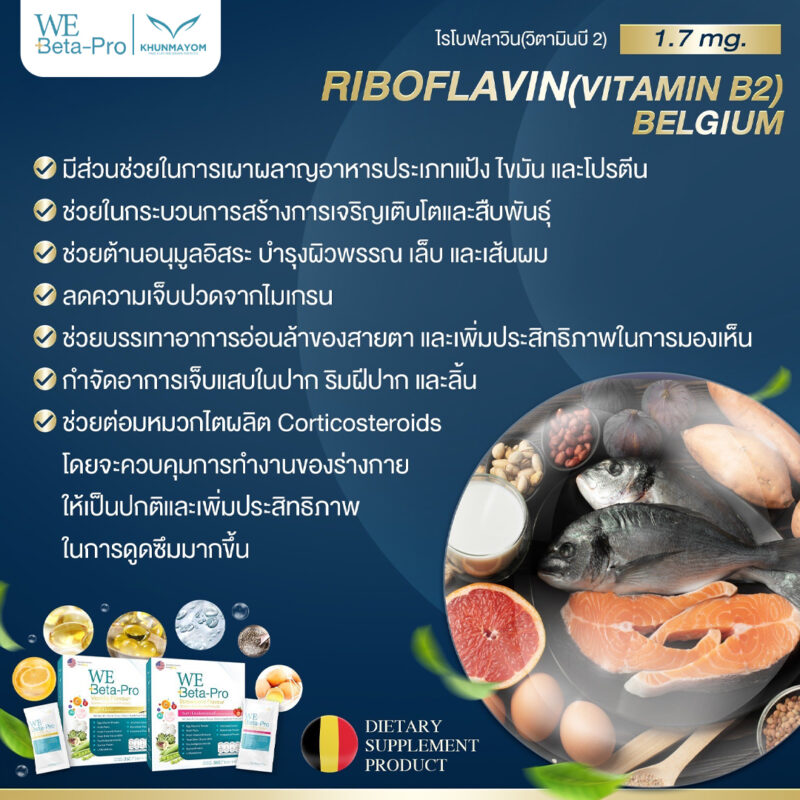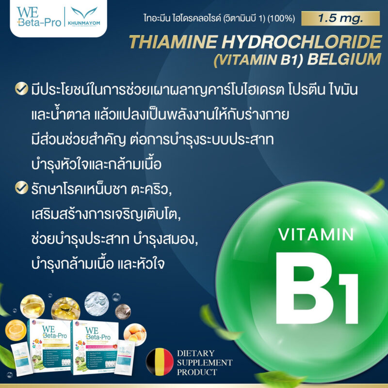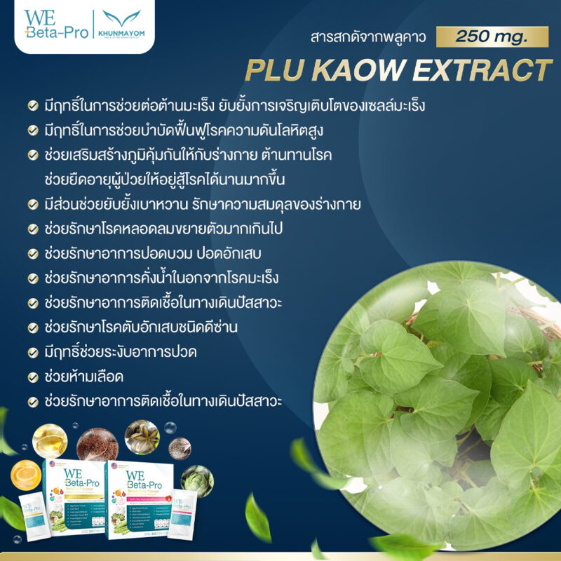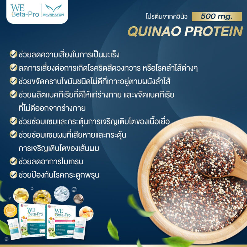 - We Beta Pro (วีเบต้าโปร) มีสารสกัดจาก เบต้ากลูแคน ซึ่งมีผลงานวิจัยมากมายหลายฉบับ ทั้งในประเทศและต่างประเทศ ว่ามีส่วนช่วยในการเพิ่มค่าการทำงานของเซลล์เม็ดเลือดขาว ได้เป็นอย่างดี เหมาะสำหรับผู้ป่วยที่ต้องการเพิ่มภูมิต้านทานให้กับร่างกายโดยเฉพาะ เช่น ผู้ป่วยโรคติดเชื้อ ผู้ป่วยโรคเบาหวาน ผู้ป่วยมะเร็งต่างๆ มีความจำเป็นต้องได้รับโปรตีนปริมาณสูงเพื่อช่วยเสริมทั้งเม็ดเลือดขาวและเม็ดเลือดแดง จึงจะช่วยให้ร่างกายแข็งแรงขึ้นได้ ป้องกันภาวะร่างการอ่อนเลีย อ่อนแรง เนื่องจากภูมิคุ้มกันต่ำ